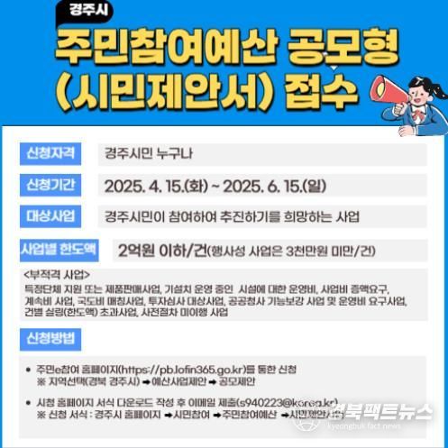 경북팩트뉴스 이영하 기자 | 경주시는 시민이 직접 참여해 재정 민주주의를 실현하는 ‘주민참여예산제’ 시민 공모를 오는 6월 15일까지 접수한다고 밝혔다.