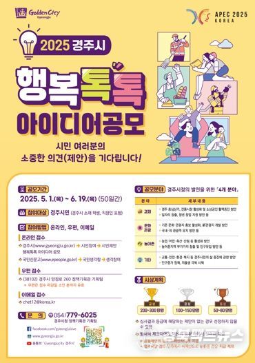 경북팩트뉴스 이영하 기자 | 경주시는 시민과의 소통을 강화하고 창의적인 시정 개선 아이디어를 발굴하기 위해 ‘2025년 경주시 행복톡톡 아이디어 공모’를 진행 중이라고 6일 밝혔다.