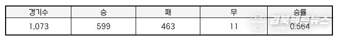 염경엽 감독은 5월 20일(화) 기준, 총 1,073경기에서 599승, 463패, 11무, 승률 0.564을 기록하고 있다.