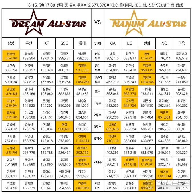 나눔 올스타에서는 1차 중간 집계 1위 후보 모두가 여전히 선두를 유지한 가운데 한화가 강세를 보이고 있다. 한화는 선발투수 부문 폰세, 중간투수 부문 박상원, 마무리투수 부문 김서현까지 투수 전 부문과 외야수 부문 플로리얼(외야수 1위), 지명타자 부문 문현빈 등 총 5명의 후보가 선두에 올라있다. LG가 포수 부문 박동원, 1루수 부문 오스틴, 외야수 부문 박해민(외야수 3위) 등 3개 부문 1위로 한화의 뒤를 잇고 있다. KIA와 NC는 각각 2명으로 KIA가 3루수 부문 김도영, 유격수 부문 박찬호, NC는 2루수 부문 박민우, 외야수 부문 박건우(외야수 2위)가 선두에 올라 있다.