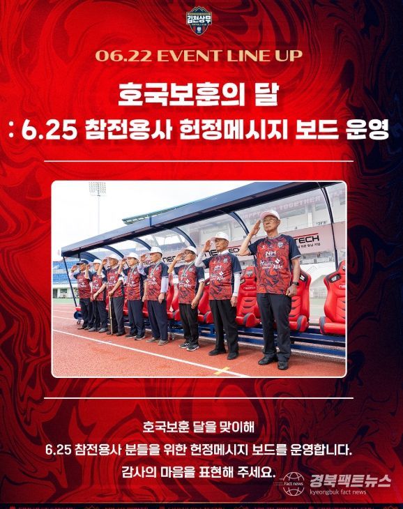 김천상무는 6.25 참전영웅과 이번 홈경기를 함께 한다. 먼저 장외 구역에서는 참전영웅의 김천상무 호국보훈 유니폼 화보 사진전이 열린다.
