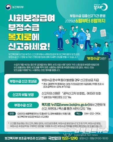 경북팩트뉴스 이경원 기자 | 보건복지부 보조금 부조리 신고센터에서 사회보장급여 및 보건복지분야 보조금의 부정수급 신고 방법 및 처리 진행상황 등에 대해 자세한 상담을 받을 수 있습니다.