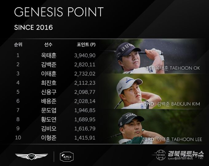 한편 옥태훈과 김백준에 이어 이태훈(35.캐나다)이 3위(2,732.02포인트), 2016~2017년 ‘제네시스 대상’ 수상자 최진호(41.코웰)가 2,112.23포인트로 4위, 신용구(34.금강주택)가 2,098.77포인트로 5위에 안착했다. 배용준(25.CJ)이 6위, 문도엽(34.DB손해보험)이 7위, 황도연(32.Mss)이 8위, 김비오(35.호반건설)가 9위, 2018년 ‘제네시스 대상’의 주인공 이형준(33.웰컴저축은행)이 10위로 TOP10을 형성했다.