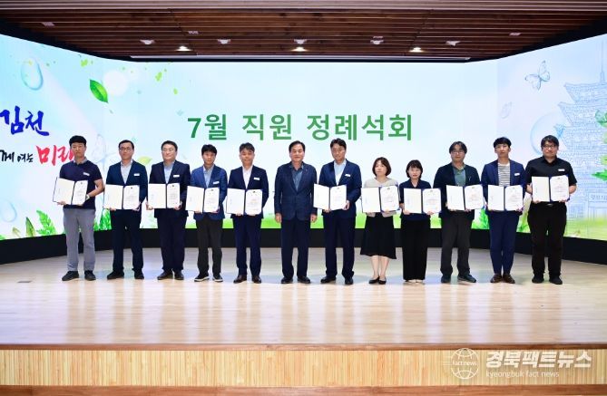 경북팩트뉴스 조현묵 기자 | 김천시는 지난 7월 1일, 적극적인 행정업무 추진으로 시민이 체감할 수 있는 성과를 창출한 『2025년 상반기 적극행정 우수공무원』 개인 8명(최우수 1, 우수 2, 장려 2, 노력 3)과 팀 3팀(최우수 1, 우수 2)을 선발했다고 밝혔다.