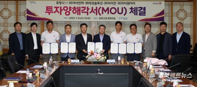경북팩트뉴스 남유신 기자 | 포항시는 9일 시청 중회의실에서 지역 철강기업 4개 사(㈜아이언텍, ㈜대성솔루션, ㈜아이언, ㈜아이엠아이)와 총 290억 원 규모의 투자양해각서(MOU)를 체결했다.