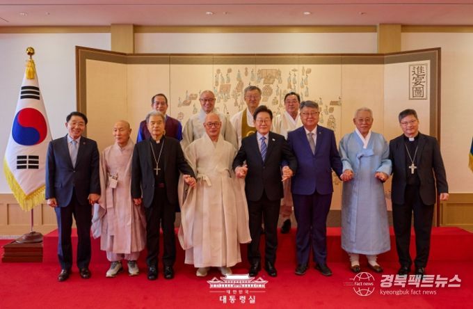경북팩트뉴스 황혜경 기자 | 이재명 대통령은 9일 대통령실에 7대 종교지도자 11명을 초청해 '사회통합의 길, 종교와 함께' 행사를 열었다고 강유정 대변인이 브리핑을 통해 밝혔다.