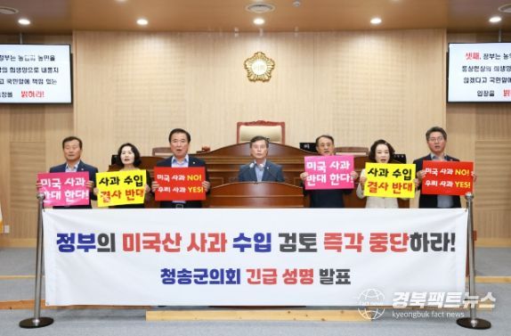 청송군의회는 심상휴 의장을 포함한 전체 의원 명의의 성명서를 통해 ‘미국산 사과 수입이 현실화 될 경우 도내 사과생산농가는 물론, 국내 과수 산업 전체가 회복 불가능한 타격을 입을 것’이 라는 강한 우려를 표명하고,