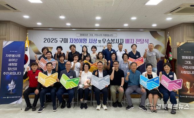 경북팩트뉴스 조현묵 기자 | 구미시는 지난 14일 구미시새마을회 4층 강당에서 ‘상반기 구미 자봉이왕 시상 및 우수 자원봉사자 배지 전달식’을 개최했다. 행사는 구미시종합자원봉사센터(센터장 하준호) 주관으로 열렸으며, 자원봉사에 헌신해 온 시민들의 노고를 격려하고 나눔 문화를 확산하기 위해 마련됐다.