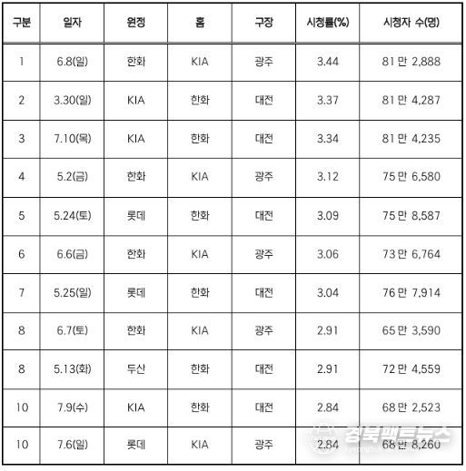 한편, 시청률 3%를 넘긴 경기는 총 7경기로 KIA-한화 간의 경기가 5차례, 롯데-한화간의 경기가 2차례 있었다. 2024 시즌 전반기에는 시청률 3%를 넘긴 경기가 전무했다. 시청률 2%를 넘긴 경기는 총 47경기로 지난 시즌 전반기의 26경기에 비해 크게 늘어났다.