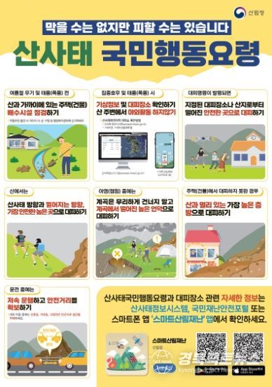 산사태국민행동요령과 대피장소 관련 자세한 정보는 산사태정보시스템, 국민재난안전포털 또는 스마트폰 앱 '스마트산림재난' 앱에서 확인하세요.