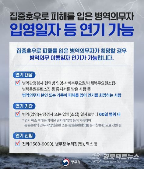 경북팩트뉴스 이경원 기자 | 집중호우로 피해를 입은 병역의무자가 희망할 경우 병역의무 이행일자 연기가 가능합니다.