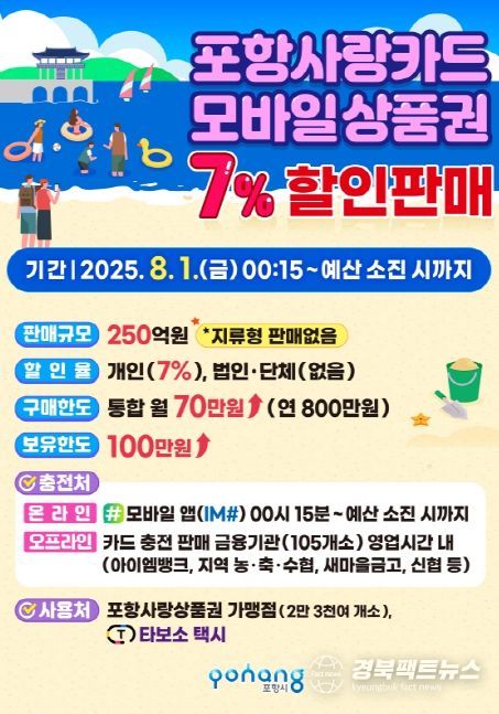 경북팩트뉴스 남유신 기자 | 포항시가 지역 소비 활성화를 위해 내달 1일부터 카드형·모바일 포항사랑상품권(이하 포항사랑카드)을 250억 원 규모로 7% 할인된 가격에 판매한다.