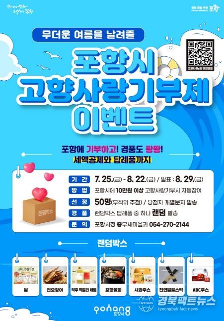 경북팩트뉴스 남유신 기자 | 포항시는 오는 25일부터 8월 22일까지 고향사랑기부제 활성화를 위한 여름철 특별 이벤트를 진행한다.