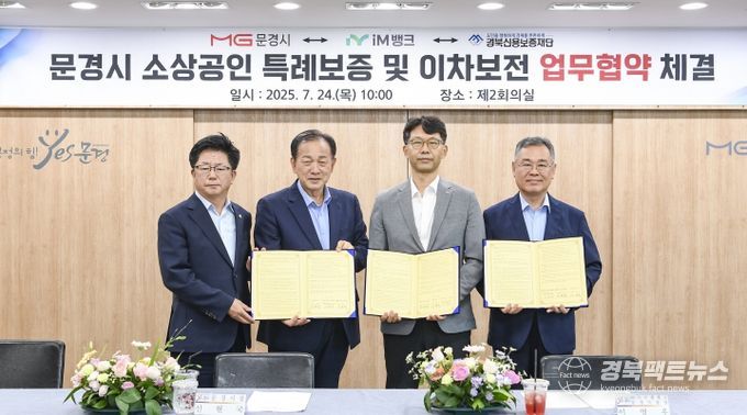 경북팩트뉴스 남유신 기자 | 문경시는 지난 24일 시청 제2회의실에서 ㈜아이엠뱅크, 경북신용보증재단과 '문경시 소상공인 특례보증 및 이차보전을 위한 업무협약'을 체결했다.