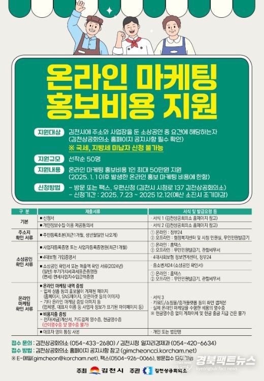 신청은 오는 12월 12일까지 김천상공회의소를 통해 선착순으로 받으며, 증빙 서류 검토와 결격 심사 후 사업자 본인 명의 계좌로 비용을 지원한다. 다만, 예산 소진 시 조기 마감될 수 있다.