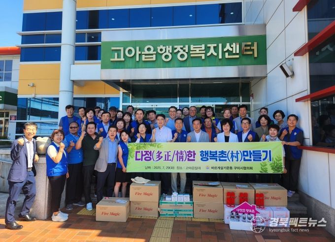 경북팩트뉴스 조현묵 기자 | 구미시는 지난 29일 바르게살기운동구미시협의회(회장 이재건) 주관으로 ‘다정(多正/情)한 행복촌 만들기’ 사업을 고아읍 항곡리 일원에서 전개했다. 이번 활동은 마을 맞춤형 봉사를 통해 주민의 생명과 재산을 지키고, 공동체 내 온정을 확산하는 데 목적을 뒀다.