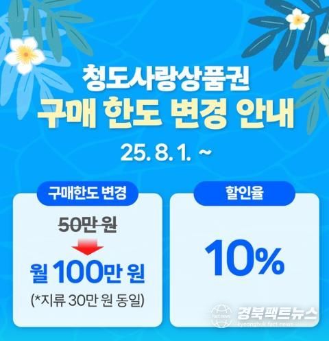 경북팩트뉴스 남유신 기자 | 청도군은 군민들의 소비 여력을 높이고 지역경제 활성화를 위해 오는 8월 1일부터 청도사랑상품권의 월 구매한도를 기존 50만원에서 100만원으로 상향한다고 밝혔다.