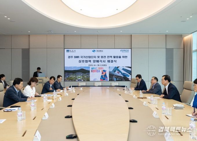 경북팩트뉴스 남유신 기자 | 경주시는 8월 1일 서울 포스코센터 회의실에서 경북도, 포스코홀딩스와 소형모듈원전(SMR) 1호기 경주 유치와 원전전력의 활용 협력을 위한 업무협약을 체결했다.
