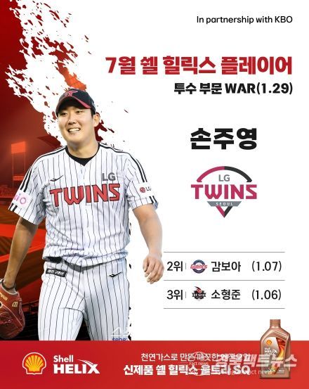 ‘쉘힐릭스플레이어’는 WAR(대체 선수 대비 승리 기여도)를 기준으로 선정하며, 7월 투수 부문에서는 LG 손주영이 WAR 1.29로 1위를 차지했다. 손주영은 7월 한 달간 총 30 2/3이닝(1위)을 소화하며, 3승(공동 1위)을 기록해 팀의 마운드를 든든히 지켰다. 특히, 긴 이닝을 책임지면서도 평균자책점 1.47(5위), WHIP 1.08(10위)을 기록하며 안정적이고 뛰어난 경기 운영 능력을 선보였다.