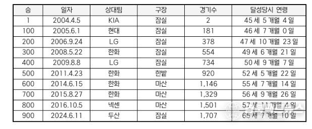 2024시즌 중 한화 감독에 선임되며 KBO 리그에 복귀한 김경문 감독은 2024년 6월 11일 잠실 두산전에서 자신의 통산 900번째 승을 달성한 바 있다.