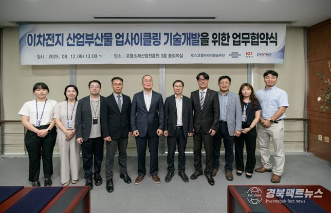 경북팩트뉴스 남유신 기자 | 포항소재산업진흥원은 지난 12일 ㈜경흥아이앤씨, 포스코필바라리튬솔루션㈜, 성신양회㈜와 ‘이차전지 산업부산물 업사이클링 기술개발을 위한 업무협약(MOU)’을 체결했다.