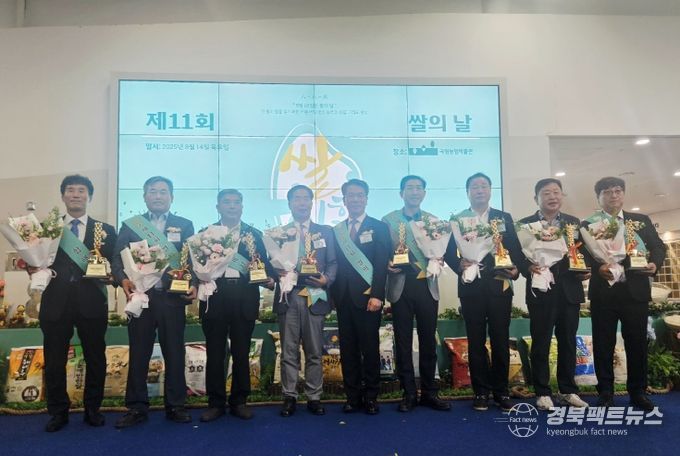 경북팩트뉴스 조현묵 기자 | 구미시 대표 쌀브랜드 ‘일선정품(영호진미)’이 지난 14일 수원 국립농업박물관에서 열린 농림축산식품부 주관 ‘제11회 쌀의 날 기념식’에서 ‘2025년 팔도 농협쌀 대표브랜드’ 경상북도 최상위(1위)로 선정되고, 전국 107개 농협쌀 중 공동 우수상(7위)을 차지했다.