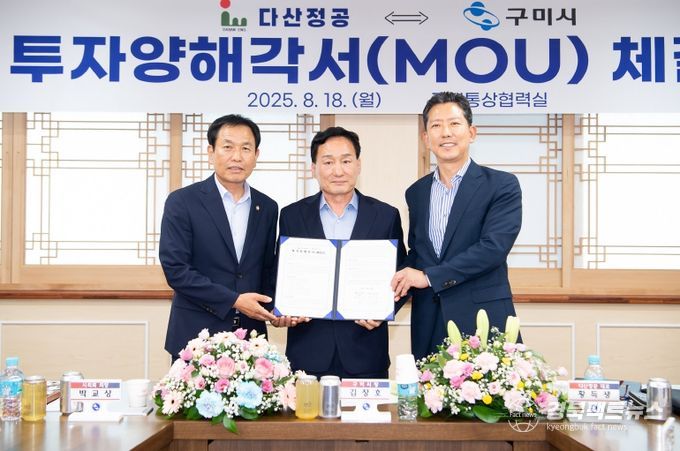 경북팩트뉴스 조현묵 기자 | 구미시와 향토기업 다산정공(대표 황득생)은 8월 18일 시청 국제통상협력실에서 김장호 구미시장, 박교상 구미시의회 의장, 황득생 다산정공 대표 등이 참석한 가운데 다산정공과 구미시 간 투자양해각서(MOU)를 체결했다.