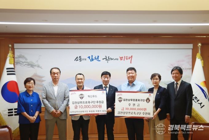 김천상무프로축구단이 8월 19일, 김천시청에서 김천상무 후원회의 후원금 전달식을 진행했다. 행사에는 김천상무 이재하 대표이사, 여영각 후원회장, 김경석 부회장, 신경원 감사, 최세은 이사, 이관영 사무국장, 최영순 재무가 참석했다.