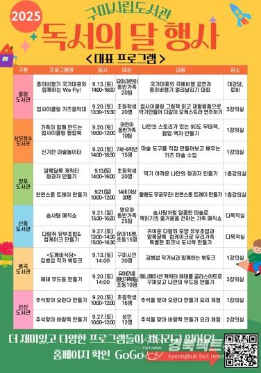 경북팩트뉴스 조현묵 기자 | 구미시는 9월 독서의 달을 맞아 시립도서관 6개관에서 작가 북토크, 종이비행기 공연, 솜사탕 매직쇼, 키즈마술, 뽑기 이벤트 등 다채로운 독서문화 행사를 개최한다.