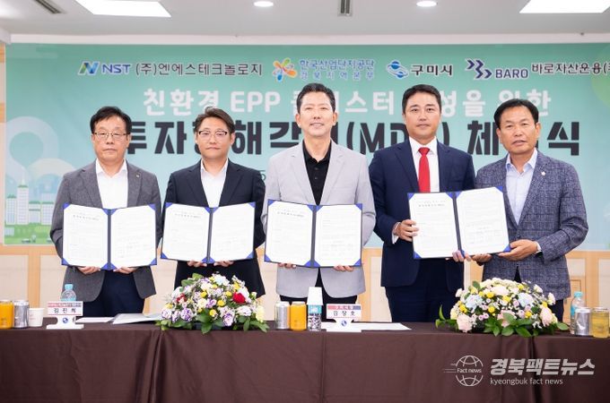 경북팩트뉴스 조현묵 기자 | 구미시는 8월 25일 시청 대회의실에서 ㈜NS테크놀로지, 한국산업단지공단 경북지역본부, 바로자산운용㈜과 함께 구미국가 3산업단지 내 ‘EPP(발포 폴리프로필렌) 클러스터’ 조성을 위한 투자양해각서(MOU)를 체결했다.