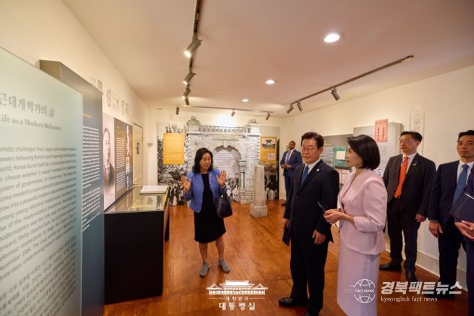 경북팩트뉴스 황혜경 기자 | 이재명 대통령과 김혜경 여사는 27일 미국 필라델피아에 있는 서재필기념관(서재필기념재단 이사장 최정수)을 방문하여 기념관 시설을 둘러보고 재단 관계자들을 격려했다.