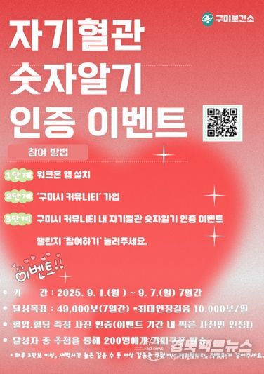 경북팩트뉴스 조현묵 기자 | 구미시는 2025년 심뇌혈관질환 예방관리주간을 맞아 ‘자기혈관 숫자알기-레드서클 캠페인’을 진행한다.
