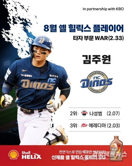 타자 부문에서는 NC 김주원이 WAR 2.33을 기록하여 8월 수상자로 선정되었다. 김주원은 8월 한 달간 타율 0.378(5위), OPS 1.123(2위)을 기록했으며, 안타 27개(3위), 도루 7개(공동 2위), 득점 21점(공동 3위)을 올리며 정확성과 장타력, 주루 능력을 두루 선보였다.