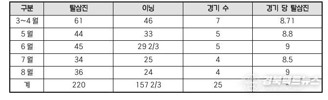 경기 내에서도 이닝 별로 큰 기복없이 1회부터 6회까지 비슷한 비율의 탈삼진 개수를 기록하고 있다. 1회 탈삼진이 33개로 전체 탈삼진의 15%를 차지하고, 6회에도 31탈삼진, 전체 14.1%로 비슷한 비율을 기록하며 경기 중-후반부에서도 힘이 떨어지지 않는 모습을 보여주고 있다.