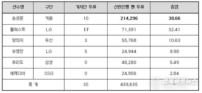 송성문은 기자단 투표 총 35표 중 10표(28.6%), 팬 투표 43만 9,635표 중 21만 4,296 표(48.7%)로 총점 38.66점을 받아, 기자단 투표 17표, 팬 투표 7만 1,391표로 총점 32.41점을 기록한 LG 톨허스트를 제쳤다.