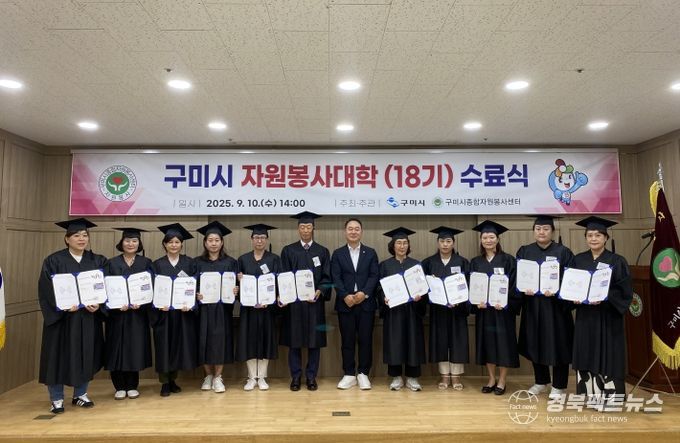 경북팩트뉴스 조현묵 기자 | 구미시는 지난 10일 구미시종합자원봉사센터(센터장 하준호) 주관으로 자원봉사대학 18기 수료식을 열고, 5개월 간 이어진 교육 과정을 성공적으로 마무리했다. 이번 수료식에서는 47명의 교육생이 수료증을 받았으며, 우수자 시상, 결의문 낭독, 소감 발표 등이 이어졌다.
