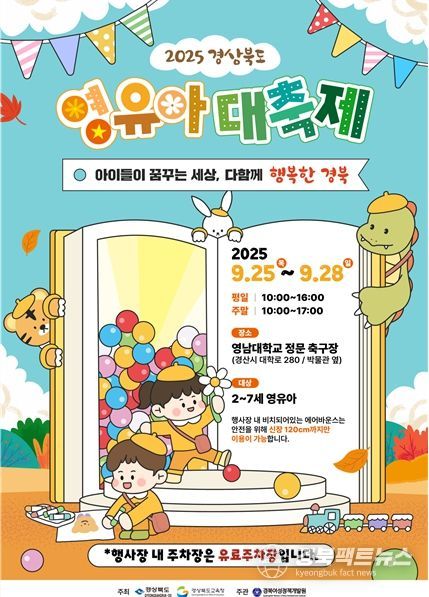 경북팩트뉴스 남유신 기자 | 경북도와 경북도교육청은 저출생 극복과 아이 우선 문화 정착을 위한 ‘2025 경상북도 영유아 대축제’를 이달 25일부터 28일까지 4일간 영남대학교 경산캠퍼스에서 공동 개최한다.
