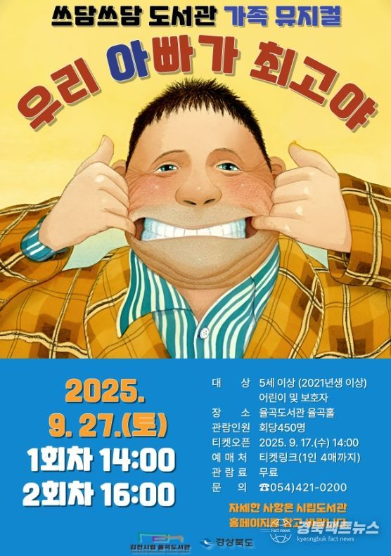 경북팩트뉴스 남유신 기자 | 김천시립 율곡도서관은 오는 9월 27일 토요일 오후 2시와 4시, 두 차례에 걸쳐 율곡도서관 율곡홀에서 가족 뮤지컬 '우리 아빠가 최고야'를 공연한다고 밝혔다.