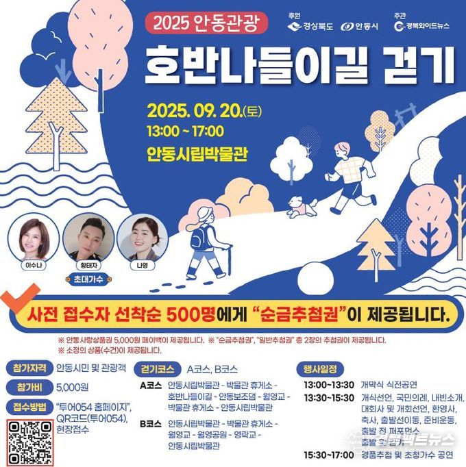 경북팩트뉴스 남유신 기자 | 안동시는 오는 9월 20일 오후 1시, 안동시립박물관 특설무대와 호반나들이길에서 ‘제12회 안동 관광 호반나들이길 걷기’ 행사를 개최한다.