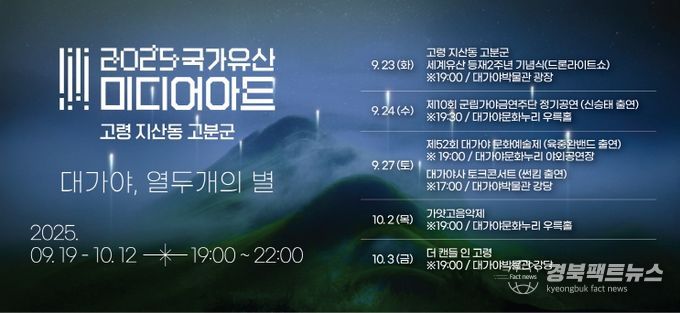 경북팩트뉴스 남유신 기자 | 고령군은 오는 9월 19일 고령 지산동 고분군을 무대로 ‘2025 국가유산 미디어아트 고령 지산동 고분군’을 개최한다.
