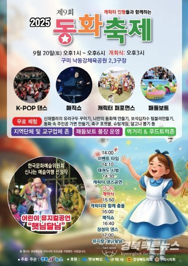 경북팩트뉴스 조현묵 기자 | 구미시와 경상북도가 후원하는 ‘2025 제9회 동화축제’가 9월 20일 오후 1시부터 6시까지 구미 낙동강체육공원 2·3구장에서 열린다.