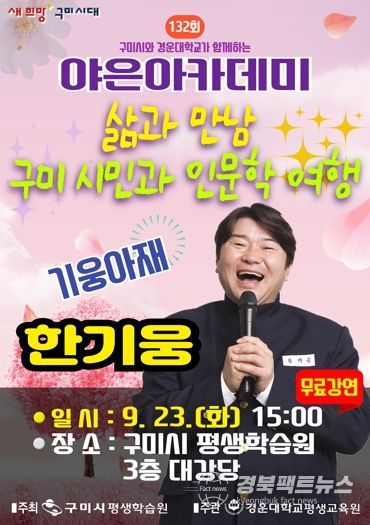 경북팩트뉴스 조현묵 기자 | 구미시는 9월 23일 오후 3시 구미시평생학습원 대강당에서 방송인 한기웅을 초청해 ‘삶과 만남, 구미시민과 인문학 여행’이라는 주제로 제132회 야은아카데미 특별 강연을 연다.