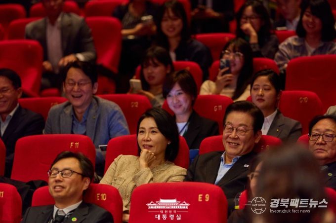 경북팩트뉴스 황혜경 기자 | 이재명 대통령과 김혜경 여사는 20일 오후, 부산 해운대 영화의 전당 시네마테크에서 앤솔로지 영화 《극장의 시간들》을 관람했다. 영화 관람 후에는 감독 및 배우들과 함께한 '관객과의 대화(GV)'에 참여했다.