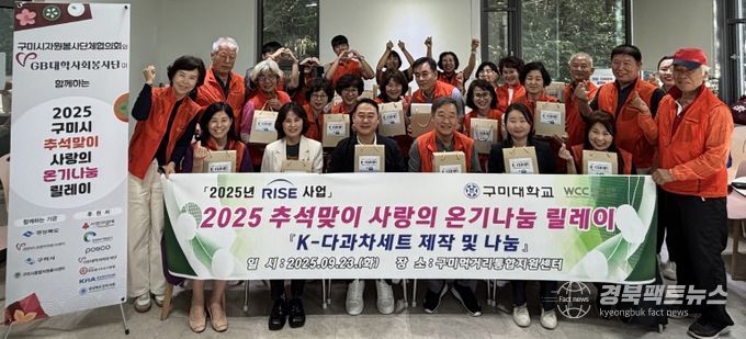 경북팩트뉴스 조현묵 기자 | 다가오는 추석을 맞아 구미시 자원봉사자들이 전통 다과를 직접 만들어 다문화 취약계층에 따뜻한 마음을 전했다. 구미시종합자원봉사센터(센터장 하준호)가 주관한 ‘사랑의 온기나눔 릴레이’봉사활동이 지난 23일 구미먹거리통합지원센터 공유주방에서 열렸다.