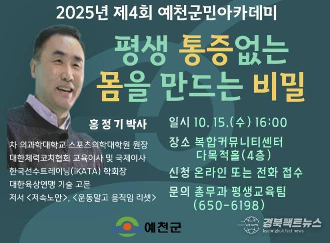 경북팩트뉴스 남유신 기자 | 예천군은 10월 15일 오후 4시, 복합커뮤니티센터 다목적홀에서 ‘2025년 제4회 예천군민 아카데미’를 개최한다.