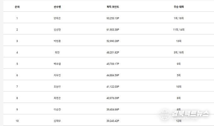 2위 김상현과 10위 김태우(27.(주)하이니스임플란트)의 포인트 격차는 22,659.96포인트다. 또한 10위 김태우와 13위 이승형(22), 17위 김범수(27)와 포인트 차는 각각 10,221.45포인트, 12,766.24포인트다. 10위 김태우와 20위 하충훈(35.㈜일신테크놀로지)와 차이는 16,500.06포인트다.