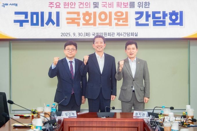 경북팩트뉴스 조현묵 기자 | 구미시는 9월 30일 국회를 방문해 구자근, 강명구 지역구 국회의원과 간담회를 열고 지역 주요 현안과 국비 확보 전략을 논의했다. 이날 간담회에는 김장호 시장을 비롯해 구미시 주요 간부 공무원 등 30여 명이 참석했다. 시는 현안 사업 추진 상황과 정부 예산 동향을 공유하며 국회 차원의 전략적 지원 방안을 모색했다.