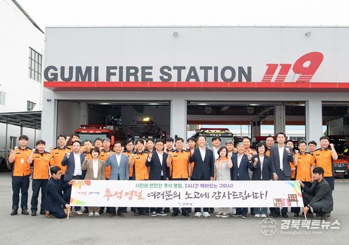 경북팩트뉴스 조현묵 기자 | 구미시는 추석 연휴 시작을 앞둔 2일, 시민들이 안전하고 편안한 명절을 보낼 수 있도록 경찰서, 소방서, 군부대, 운수업체 등 비상근무 중인 유관기관을 차례로 방문해 근무자들을 격려했다.