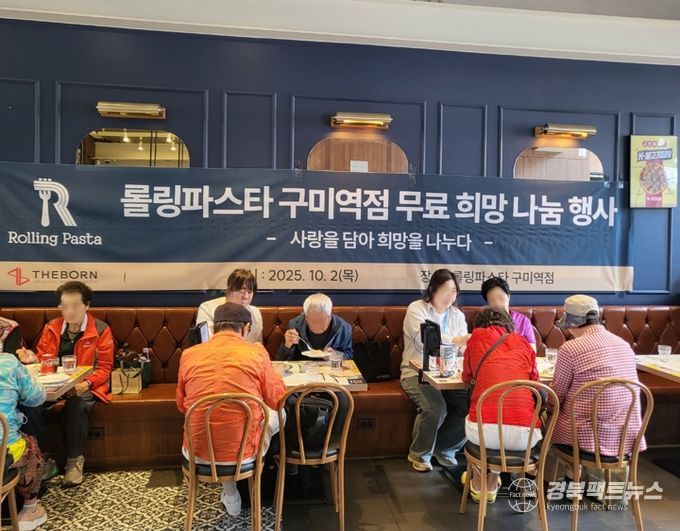 경북팩트뉴스 조현묵 기자 | 롤링파스타 구미역점과 료혼구미특별관(대표 김경호)은 2일, 구미지역 아동과 어르신 250여 명을 식당으로 초대해 정성 어린 식사를 대접했다. 이번 행사는 관내 재가노인통합지원센터와 지역아동센터의 협조로 진행됐다.