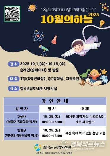 경북팩트뉴스 남유신 기자 | 칠곡군립도서관은 한국도서관협회와 10월의 하늘 준비위원회가 공동 주최하는『10월의 하늘: 과학자들의 재능기부 도서관 과학 강연』공모사업에 선정되어 오는 25일 오후 2시에 강연을 개최한다.